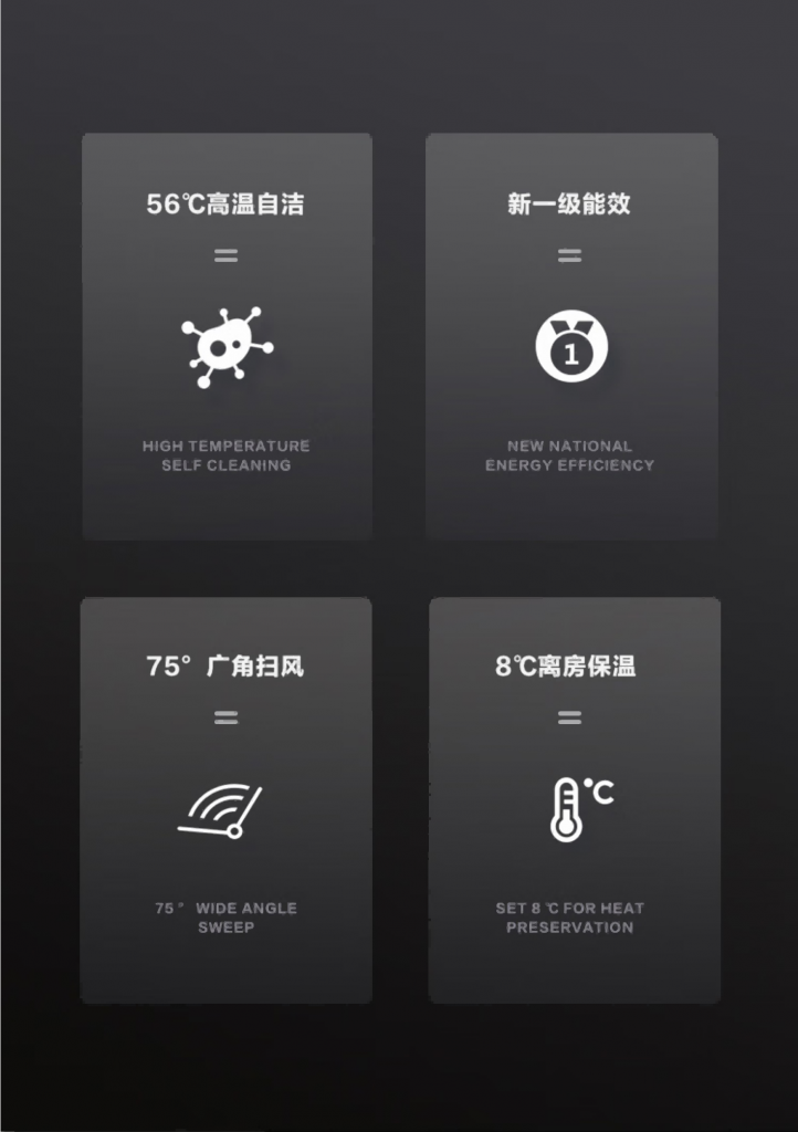 仿布纹注塑工艺,第二代冷酷外机,56℃净菌自洁,新一级能效,75°广角扫风,8℃离房保温