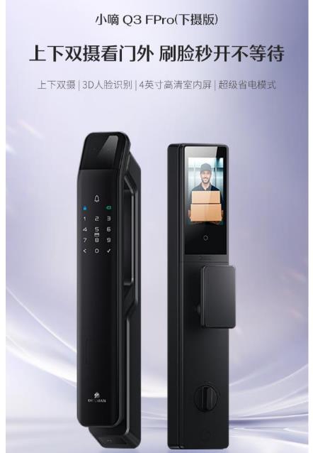 上下双摄猫眼,分别查看门前与地面动态,3D人脸识别,AI智能猫眼, 门外有人逗留,立即抓拍告警,4英寸高清室内屏,5000mAh大锂电, 搭载超级省电模式,循环充电持久续航,智能疾速降噪锁体
