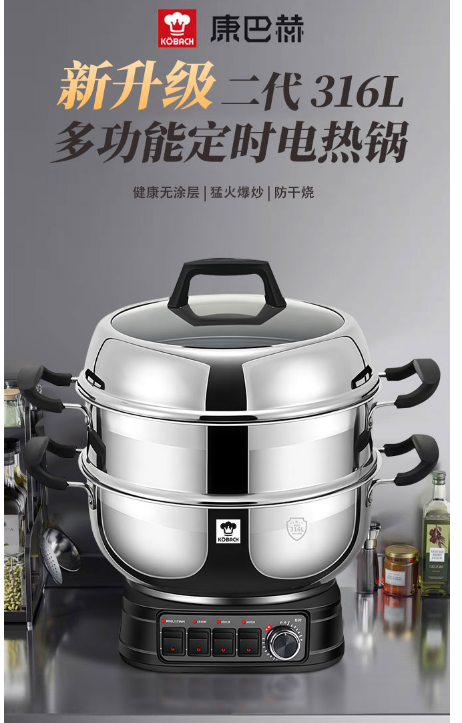 花样料理, 一锅多用, 无需繁琐换锅,满足更多烹饪场景,严选母婴级316不锈钢,4档按键 6种组合,智能防干烧,自动断电,避免干烧