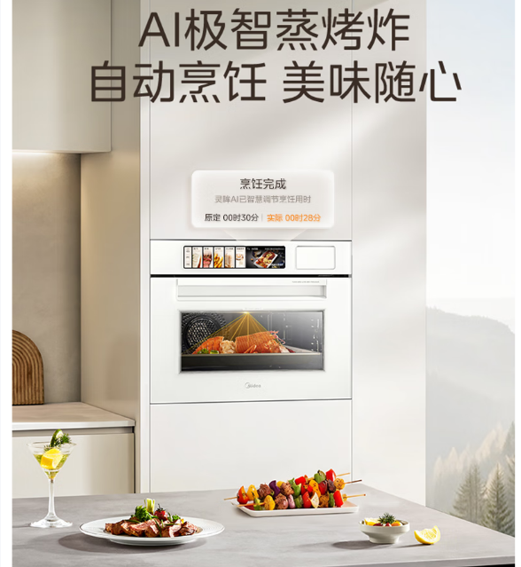 AI极智烹饪, 自动出餐,极智烘烤 ,可酥可嫩,极智鲜烹 ,长效续航,纯平全嵌 ,一体大气