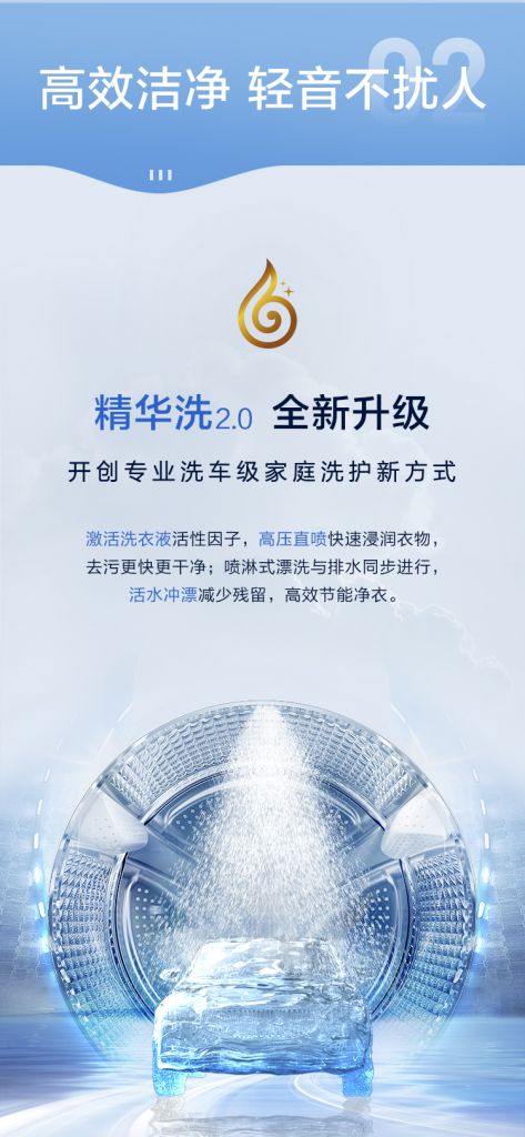 全新升级精华洗2.0,去污更彻底,洗衣更省时,升级活水喷淋,漂洗高效减少洗涤剂残留,升级动平衡装置,动力更平稳相对更静音,升级双智能投放洗衣更省心