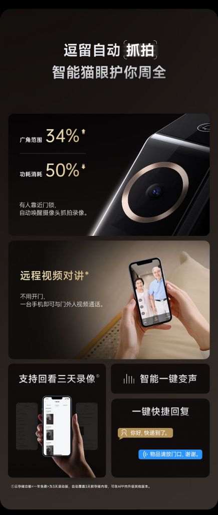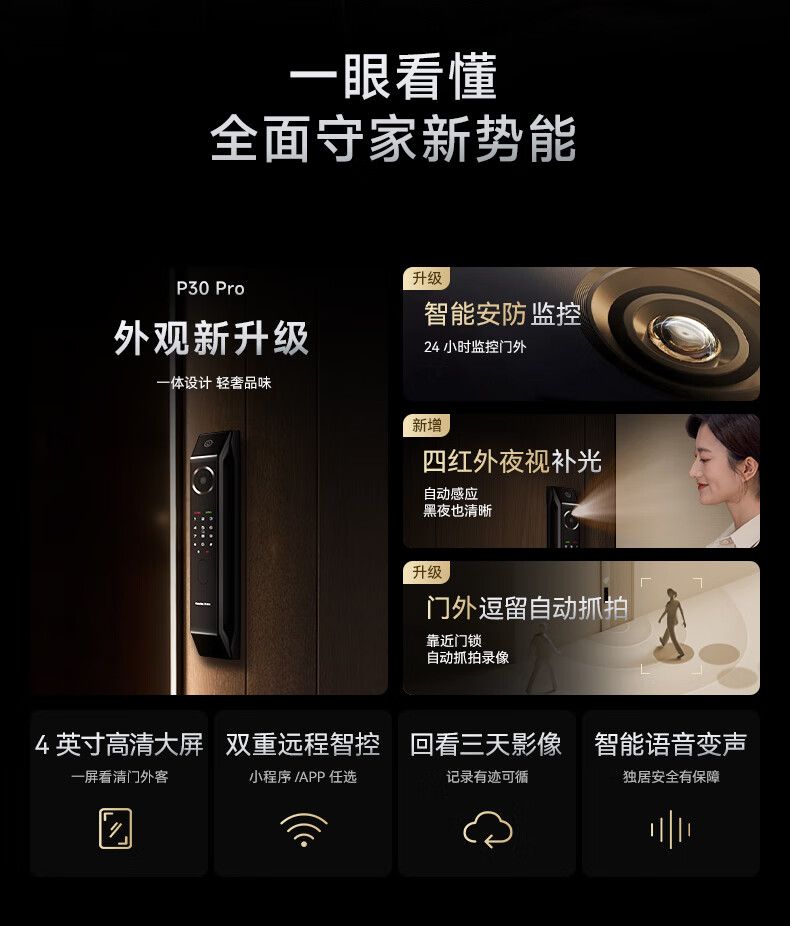 外观新升级,智能安防监控 24 小时监控门外,四红外夜视补光,门外逗留自动抓拍,4 英寸高清大屏, 双重远程智控,回看三天影像,智能语音变声