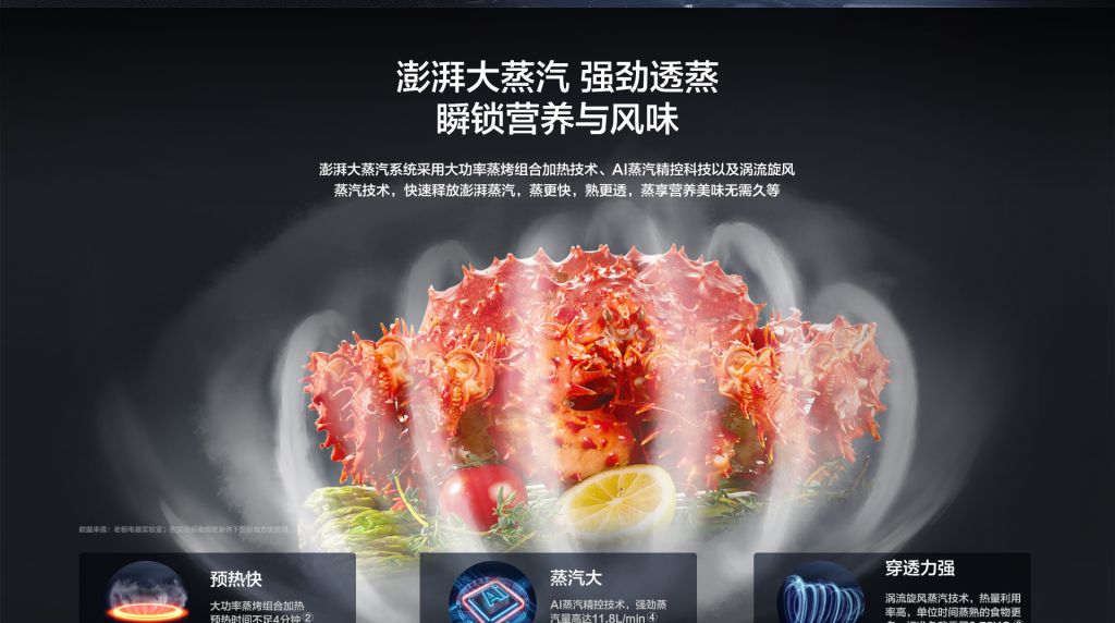 蒸烤混动系统,,澎湃大蒸汽,,5+1多维匀烤,多段组合烹饪,无油空气炸,73L盛宴容量56道自动菜谱,静音阻尼缓门
