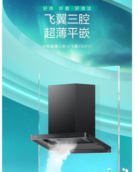 26立方大吸力,1100Pa最大静压,三腔分区拢烟,21°下潜机身,加速导烟翼,三维超薄机身,烟灶联动