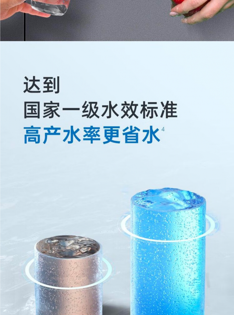 400G总净水量,3芯5级精滤 滤除重金属3,4年RO寿命,符合国家一级水效,FMS智能滤芯管理系统省心更安心,双出水龙头随心切换场景