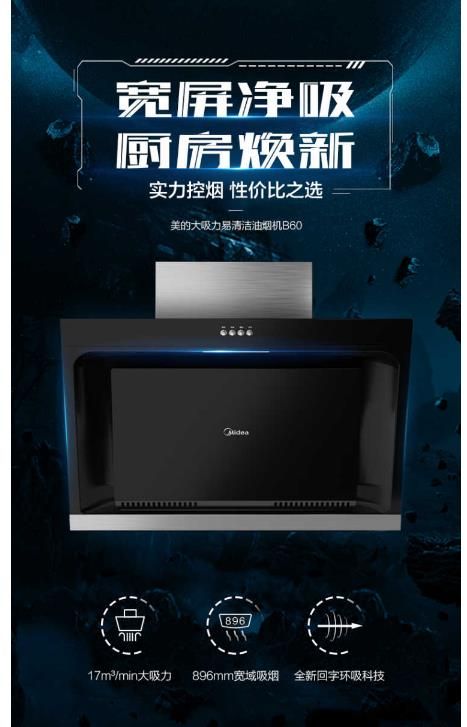 美的宽屏净吸,17m3min大吸力 ,896mm宽域吸烟, 全新回字环吸科技,四面八方不跑烟,可拆卸隔烟屏,耐油污易洁涂层,清洁无忧