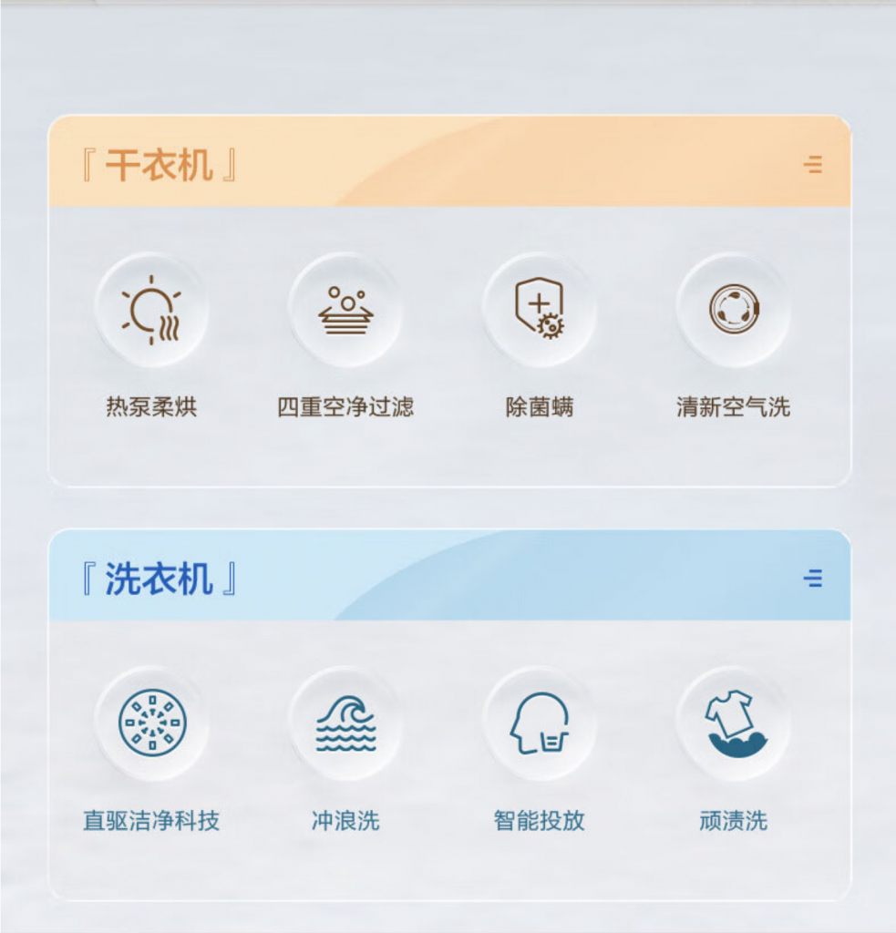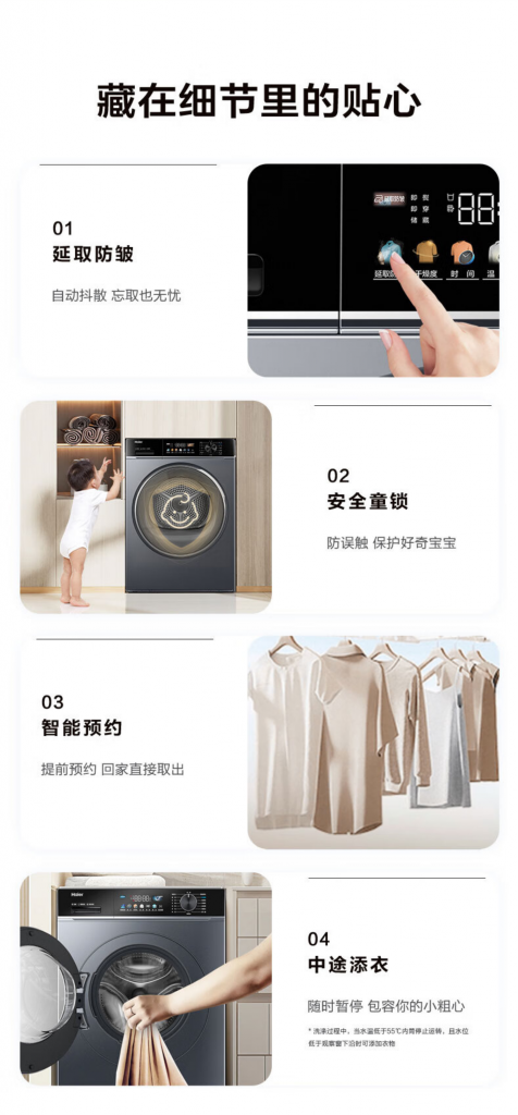 海尔初色系列,薄嵌有型,洗烘出色,热泵柔烘 ,四重空净,过滤除菌螨 ,清新空气洗,直驱洁净,科技冲浪洗, 顽渍洗,智能投放